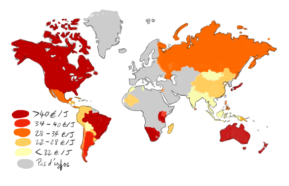 Nous avons un budget moyen de 44€ par jour et par personne; ce montant va bien sur dépendre du type de pays traversé... En Amérique du Nord, en Océanie et au Japon le budget moyen sera de 55€/j/pers. et en Amérique du Sud, et en Asie le budget moyen sera de 33€/j./pers.