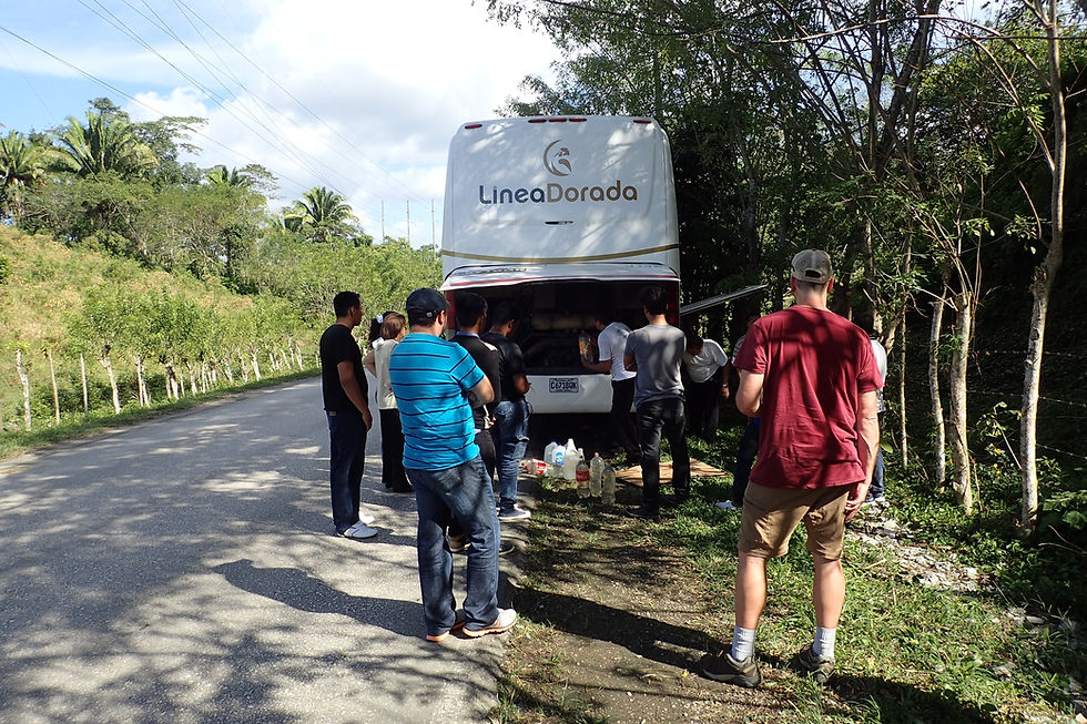 At 10am we left for 10h bus ... After comparing the price of a few bus lines we decided to take the cheapest company we found: Linea Dorada. We will soon understand why they were the cheapest ... After only 2h of driving we had to stop on the side of the road because of an overheating engine. The bus was apparently losing coolant and the drivers were trying to get water back into the radiator. After an hour and a half of waiting and countless phone calls to the company's mechanic, we went back in the bus and drove for an hour to Rio Dulce where we changed of bus.