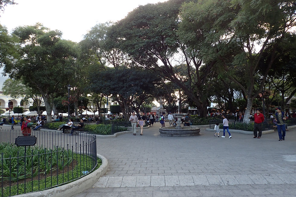 Nous avons trouvé un bus pour rejoindre la ville d’Antigua en début d’après-midi. En attendant nous avons fait un tout petit tour dans la zone 1 de la ville de Guatemala et le moins que l’on puisse dire c’est que cette ville ne fait pas plus rêver de jour que de nuit. En effet, les rues sont sales et bruyantes et il n’y a pratiquement rien à voir ou à visiter. A Antigua, au contraire, les rues sont pavées et vraiment charmantes avec leurs petits magasins. Le parc central est bordé d’un marché d’artisans locaux et la nuit venue les arbres arborent les illuminations de Noël. Nous sommes tous les deux tombés sous le charme de cette petite ville Guatémaltèque qui était autrefois la capitale du pays. En raison des conditions sismiques et de sa situation géographique au milieu des volcans, la capitale a été déplacée à 40 km à l’Ouest (là où se trouve actuellement Guatemala City).