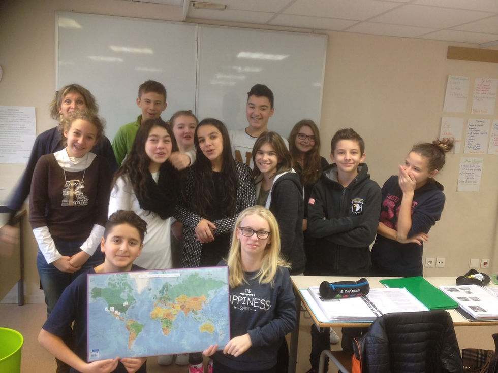 Nous profitons de cette nouvelle année 2017 pour vous présenter la classe de 5e 1 du collège des Allobroges de La Roche sur Foron qui fait partie de notre aventure. En effet, ils nous suivent dans notre voyage depuis le début et nous sommes ravis de correspondre avec eux le plus souvent possible pour répondre à leurs questions et leur faire découvrir avec nous les 4 coins du monde. Un grand merci à Mme Audigier qui a rendu cette expérience possible et qui nous permet de rester en contact avec les élèves. Nous sommes plus que fier de vous faire partager nos expériences et de vous compter à nos côtés. Nous avons bien reçu votre parchemin très précieux avec vos petits mots qui nous ont énormément touchés, merci infiniment. Nous vous souhaitons à tous une excellente année 2017, qu’elle soit riche en découvertes. A très très vite pour de nouveaux messages.