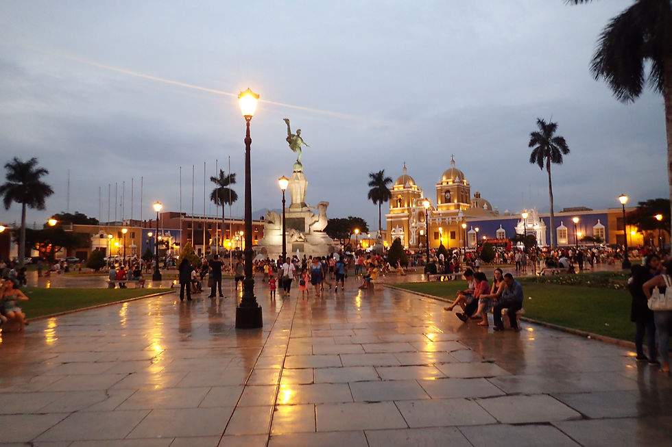 Après une nuit entière dans le bus depuis Cuenca et avoir passé la frontière à 1h du matin nous arrivons à Chiclayo au Pérou à 10h. Comme cette ville n’a aucun attrait particulier, nous reprenons directement un bus pour la ville de Trujillo à 4h de route supplémentaires. Une fois sur place nous trouvons une auberge et filons se promener dans la ville très sympathique. La place centrale est immense et toujours très animée, les maisons qui la bordent sont toutes très colorées et la cathédrale de la ville jaune moutarde est originale. Comme on n’avait pas trop le moral après avoir quitté nos amis, nous sommes allés dans un très bon restaurant pour s’offrir un filet mignon qui nous a réchauffé le cœur.