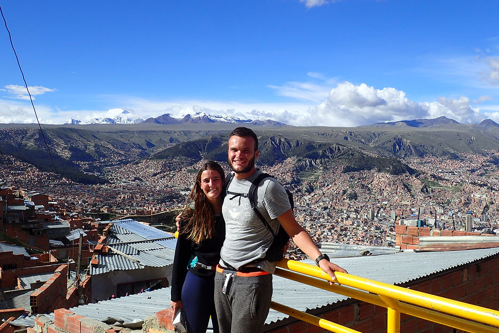 Au réveil, nous partageons notre petit-déjeuner avec deux couples de français adorables. Claire et Mathieu, les toulousains partagent notre dortoir. Ils voyagent pendant 5 mois et ont déjà parcouru un bon nombre de pays. Sarah et Valentin, les normands sont en Amérique du sud pendant deux mois et ont prévus une belle petite boucle entre Pérou, Bolivie et Argentine. On passe une bonne partie de la matinée à discuter de nos expériences. On part en fin de matinée avec Sarah et Valentin à la découverte de la ville en prenant un peu de hauteur grâce aux téléphériques. Claire et Mathieu eux ont décidé de prendre la route en direction de Santa Cruz. On prend donc la ligne rouge qui nous mène sur les hauteurs de la capitale. La vue est extraordinaire et permet de se rendre compte de l’ampleur de la ville. Il y a des maisons absolument partout et plus un seul espace de disponible. Il a même des habitations sur la pente des montagnes alentours. Sur le plateau qui domine la ville, on fait un petit tour du marché jusqu’à une petite église charmante. Puis, on se pose un moment à un point de vue avant de redescendre. On se met alors en quête d’un endroit pour casser la croute mais, comme il est dimanche, beaucoup de restaurants sont fermés et les cafés ouverts sont chers. On se rabat donc sur un restaurant qui propose poulet, riz, frite (ça commence à devenir une habitude…) mais ce n’est pas si mal que ça au contraire. Une fois que l’on a repris des forces on se lance à l’assaut du deuxième téléphérique de la journée : la ligne jaune. Elle aussi nous mène sur les hauteurs mais de l’autre côté de la ville. Nous sommes toujours autant émerveillés et restons un moment en haut à discuter jusqu’à ce qu’il fasse un peu trop froid. De retour à l’auberge, on retrouve avec surprise mais grand plaisir Claire et Mathieu qui ont décalé leur départ pour passer une soirée avec nous. On passe un excellent moment à boire des bières et jouer au dutch (renommé chpounz par Sarah) un jeu de cartes que Maud et Aurélien nous ont appris. Merci les copains parce que votre jeu a toujours un succès fou !