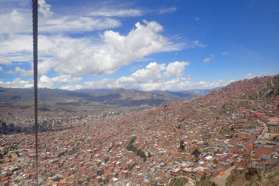 When we wake up, we share our breakfast with two lovely French couples. Claire and Mathieu from Toulouse with whom we share our dormitory. They travel for 5 months and have already went through lot of countries. Sarah and Valentin from Normandie are in South America for two months and have planned a nice little loop between Peru, Bolivia and Argentina. We spend much time in the morning discussing our travel experiences. As such, we leave the hostel late in morning with Sarah and Valentin to discover the city by taking a little height thanks to the cable lift. On their side, Claire and Mathieu decided to take the road towards Santa Cruz. First, we take the red line which leads us to the heights of the capital. The view is amazing and makes us realize the magnitude of the city. There are houses absolutely everywhere and there is not a single space available. It even has dwellings on the slopes of the surrounding mountains. On the plateau which dominates the town, we made a small tour of the market until a small charming church. Then, we stop a moment to a point of view before going down. We then look for a place to eat but, as it is Sunday, many restaurants are closed and the few open cafes are expensive. We finally found a restaurant that offers chicken, rice and french fries (it starts to become a habit ...) but it's not that bad, on the contrary it is pretty good. Once we regained strength we launched the second part of the day: the yellow line. It also leads us on the heights but on the other side of the city. We are always as much amazed by the view and stay a moment up there to discuss until it gets a little too cold. Back at the hostel, we find with surprise but great pleasure Claire and Mathieu who shifted their departure to spend an evening with us. We spend a great time drinking beers and playing dutch (renamed chpounz by Sarah) a card game that Maud and Aurélien have taught us. Thank you friends because your game always has a crazy success!