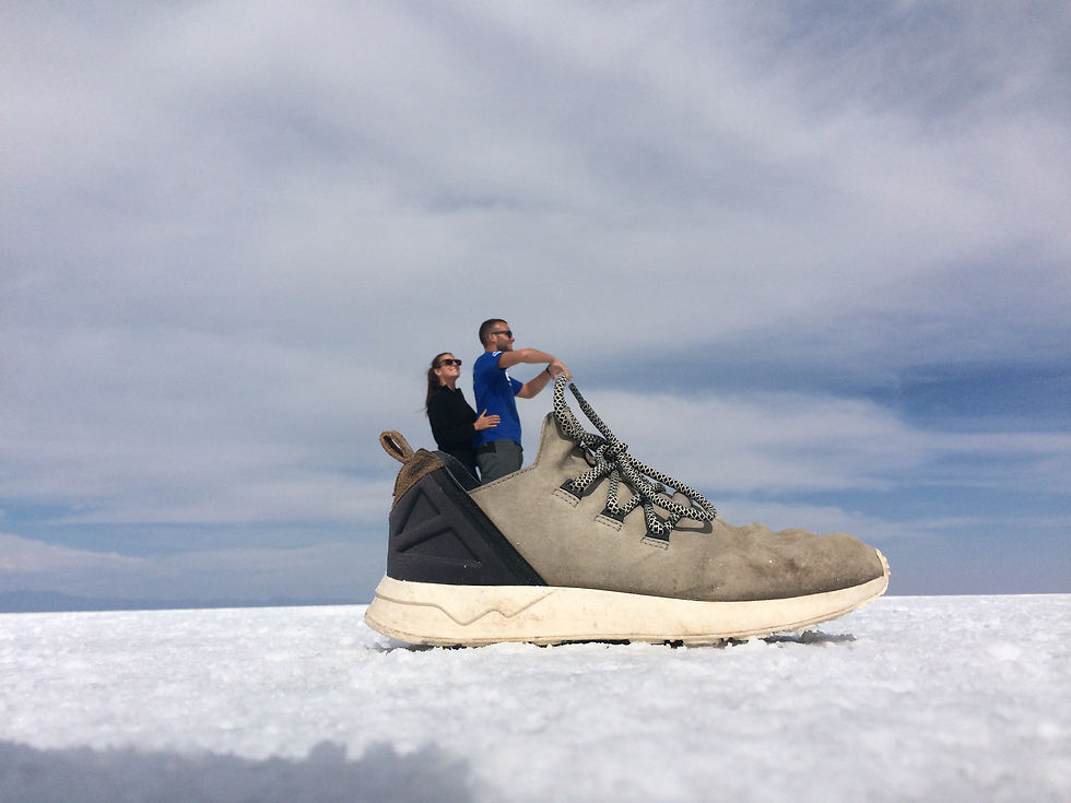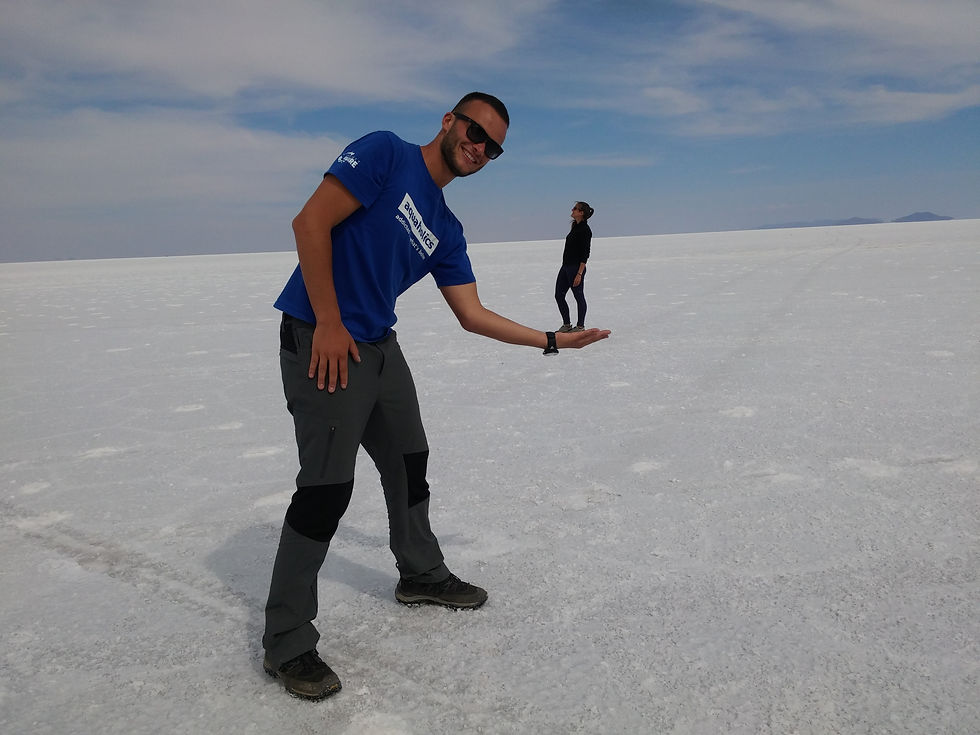 1er jour - nous faisons la connaissance de notre groupe Daniel (Allemand), Matthew (Anglais), Alicia (Italienne) et Max (Anglais). Ils ont tous ont l’air sympa et heureusement car nous allons passer 3 jours ensemble... Nous rencontrons aussi Robert notre chauffeur, guide, cuisiner, et ambianceur. Il est tout petit mais aussi plein d’énergie que de bonne humeur ;). Une fois toute l’équipe embarquée, on prend la direction du cimetière de trains. Il s’agit de vielles locomotives à vapeur autrefois utilisées pour le transport de minéraux de la Bolivie au Chili qui sont aujourd’hui à l’abandon à l’extérieur de la ville. On se dirige ensuite vers le désert de sel le plus grand du monde (12'000 km² de superficie) : le Salar d’Uyuni. L’immensité de ce désert est incroyable : on ne voit pas le bout de cette étendue de sel. On déjeune dans un « hôtel de sel » qui est en réalité un bâtiment construit de brique de sel où toutes les compagnies se regroupent à l’heure de midi. L’après-midi c’est le moment des photos rigolotes dans le désert. Le guide nous aide avec des effets de perspective pour obtenir des résultats plutôt insolites. On rigole bien avec tout le groupe pour les vidéos tous ensemble. Nous terminons la journée avec le coucher du soleil sur le Salar, vraiment magnifique !