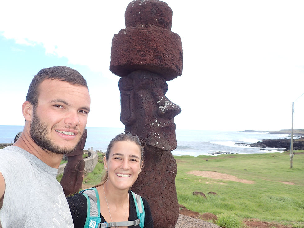 On profite de la matinée pour se reposer un peu, un peu trop d’ailleurs… On a oublié que l’on devait rendre les vélos à 10h et on a juste le temps de prendre un petit-déjeuner en vitesse avant de foncer au magasin en ville. Nous décidons de prendre la matinée pour commencer à programmer la suite de notre voyage en Polynésie. C’est une bonne stratégie car le soleil se remet à briller en début d’après-midi. Nous prenons donc le chemin du volcan Rano Kau au sud de l’ile à pieds cette fois-ci. On passe par une nouvelle grotte avant d’entamer la montée sur le cratère où nous croisons le chemin de deux chiens vraiment gentils qui décident de nous suivre pendant l’ascension. Ils tirent la langue et nous aussi : il fait chaud et on est en plein cagnard. Une fois au sommet, nous nous rendons compte que l’effort en valait la peine. La vue sur le cratère est impressionnante de par sa taille. C’est d’ailleurs là qu’on décide de s’installer pour notre pause pique-nique. Malheureusement, les chiens nous quittent pour trouver un endroit où s’abreuver. L’après-midi, nous visitons le site d’Orongo qui est un ancien village religieux situé sur le flanc du volcan. Ses maisons basses faites de pierres plates et faisant face à l’océan font de ce site un lieux privilégié où les habitants de l’ile organisaient la compétition des « birdman » (littéralement hommes-oiseaux). L’épreuve consistait à rejoindre l’ile de la fécondité en bravant la falaise et les vagues violentes. Une fois sur place, ils y restaient quelques jours voire quelques semaines pour trouver un œuf d’oiseau migrateur avant de le ramener au village en premier après avoir escaladé des falaises de 300m de haut qui surplombent les rochers. Le gagnant devient alors le nouveau chef religieux de la tribu. On redescend tranquillement jusqu’au camping où l’on prend l’apéro avant une belle soirée au restaurant. Les ceviches sont toujours aussi délicieux.