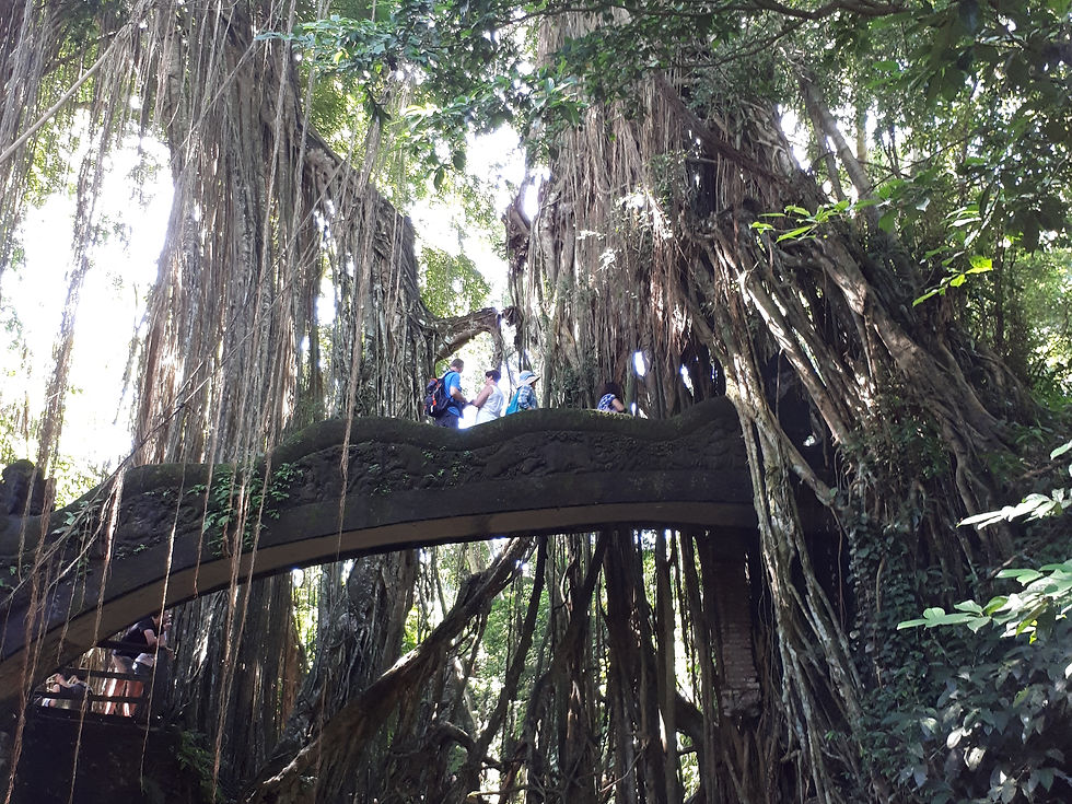 Nous avons eu un peu de mal à trouver le sommeil avec le concert de Bob Marley de l'autre côté du mur de notre dortoir mais une fois les yeux clos la nuit a été bonne. Le lendemain matin, nous remontons sur le scooter direction Ubud et nous faisons une pause sur la route près d’un temple où nous observons les locaux faire des offrandes sur un hotel. Il faut savoir que la plupart de la population est musulmane en Indonésie excepté sur l'île de Bali où la proportion d'indous est supérieure. Nous déjeunons à Ubud, la capitale culturelle de l'île et on comprend vite pourquoi. Il a y des petits temples à chaque coin de rue. Malgré un petit souci de carte bancaire bloquée par la banque, nous arrivons à payer notre déjeuner et l’entrée de la forêt des singes. Beaucoup plus agréables et moins chapardeurs que leurs collègues sur la péninsule, quelques centaines de spécimens peuplent ce petit coin de jungle très appréciable. Nous ne rentrons pas trop tard car demain le réveil sonne à 6h.