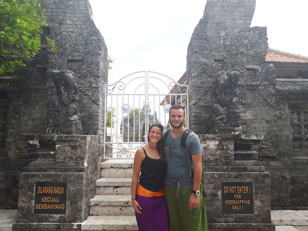 Après une arrivée mouvementée à l'aéroport de Bali (la mafia des taxis est toujours présente), on trouve notre auberge sur Kuta où nous passons une bonne nuit. Au petit-déjeuner, nous rencontrons d'autres français voyageurs (décidément on est partout) qui nous donnent quelques conseils pour notre séjour. Du coup, on opte pour la location d’un scooter à la journée afin de découvrir le temple de Pura Luhur Uluwatu sur la péninsule sud de Bali. La prise en main est facile mais la conduite à l'indonésienne c’est un peu la loi du plus fort ou de celui qui a le moins peur d’abimer son véhicule! On roule à gauche mais à part ça, il n'y a visiblement pas d'autres règles... Nous arrivons en un seul morceau à l'entrée du temple (et c'est bien l'essentiel) mais avec plus une goutte d'essence dans le réservoir! La jauge n'était donc pas en panne et nous nous rendons compte que nous avons eu le scooter presque sans carburant. Nous visitons le temple qui nous émerveille. Ce sont nos premiers pas en Asie et cela fait du bien de découvrir un nouvel univers et une nouvelle culture. Nos esprits voyageurs sont à nouveaux tout excités par ces nouvelles découvertes. De petits singes tout mignons en apparence ont élu domicile ici. Ce sont de véritables chapardeurs qui volent chapeau, lunettes et même tongs aux touristes. Ils ne rendent leur butin que contre un paquet de cacahuètes, plutôt malin. Du coup certains d'entre eux ont un bon embonpoint. Au moment de partir, nous sommes bien contents de trouver une mini-pompe à essence qui nous dépanne de 2 litres d'essence. On peut donc repartir en quête de notre premier déjeuner en Indonésie. La nourriture locale est une délicieuse découverte (et redécouverte pour Thomas)! Le riz, poulet, œuf cuisiné ici est bien meilleur que tout ce que l'on a pu goûter en Amérique du Sud. On n’est pas prêt de s'en lasser... Nous arrivons sur la plage de Kuta en fin d’après-midi afin d’observer le coucher du soleil avec quelques centaines d'autres personnes ayant eu la même idée. On assiste aussi à un lâché de bébés tortues assez épique. La journée se termine autour d'une bonne assiette.