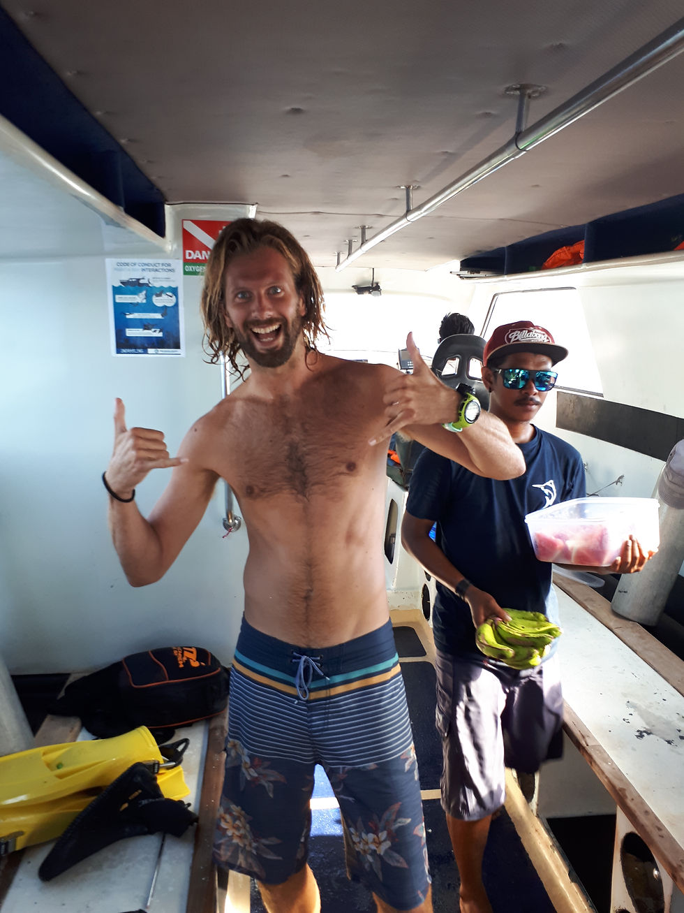 This is already the last day of diving at the Komodo. We are sad but we enjoy this day thoroughly! For the first dive of the day, we go back to 40m to do some fun exercises. Before going under water, Shannon made us draw on a small picture a house with a door and two windows, a sun, a dog and a tree. We must reproduce underwater exactly the same design, it was really very fun. We also did an exercise of speed. On a small board are randomly numbered the numbers from 1 to 16 surrounded either by a square, a triangle or a circle. We have to touch our forehead, nose or chin respectively, and do that for all the numbers as quickly as possible. We compare our time on the surface and at 40m for the same exercise and in the end we are even faster under water. Like what Thomas and I must have an old life fish hahaha. The other two dives are all as impressive as the previous ones and we are still as much amazed at the underwater scenery that the Komodo Islands have to offer. In the evening, we are officially certified deep divers, a huge THANK YOU to Shannon our super instructor and all the crew of the boat with whom we spent 4 fantastic days. We finish the day with Dave, our diving colleague, at the best Italian restaurant in town. We should have tried this restaurant before because it is just amazing. We cracked for a tray of Italian cheese to die for that we devoured.