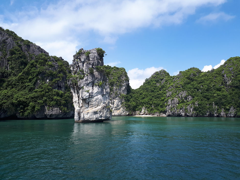 Le pick-up est prévu à 8h mais, comme la veille nous avons eu du mal à nous faire comprendre pour indiquer où se situe notre hôtel, on se place dans la rue principale pour être bien visible. D’une manière générale, les vietnamiens ne parlent pas aussi bien anglais que leurs voisins cambodgiens ou encore les thaïlandais ou les indonésiens. Un van s’arrête devant nous et le chauffeur nous demande notre ticket qu’il examine avec minutie durant une dizaine de seconde. Finalement, il nous dit de monter mais on n’est pas sûr que ce soit la bonne personne. Malgré tout, il nous amène à un bateau et même si on pense que ce n’est pas celui qu’on avait réservé, cela n’a pas vraiment d’importance car toutes les compagnies proposent plus ou moins la même chose : kayak dans les grottes, déjeuner, baignade et visite de l’ile des singes. Cela nous permet de faire la connaissance de Fanny, Nicolas et Damien, trois français qui ont déjà pris place ensemble autour d’une table. Du coup, on se joint à eux et on fait un peu connaissance. La navigation dans la baie de Lan Ha nous offre une vue extraordinaire. C’est vraiment ce à quoi on s’attendait et au final la baie est si grande que les multiples bateaux au départ se dispersent et on apprécie cette tranquillité. Au premier stop, c’est une heure de kayak deux places qui nous attend. Nous n’avons pas le choix, il va falloir faire mieux que notre dernière tentative à Maupiti (en Polynésie), où Thomas était rentré avec le kayak et moi à pied par la plage à cause de notre incapacité à manœuvrer le kayak à deux hahaha. Nous allons nous trouver quelques excuses : le kayak à Maupiti était d’assez mauvaise qualité et plein d’eau (percé). Ce n’est pas le cas aujourd’hui et tout se déroule super bien. C’est vraiment très beau même s’il y a malgré tout pas mal de monde. Pour le déjeuner, on se retrouve tous les cinq autour d’un menu très copieux : nems, riz, omelette, frites, légumes, viande… On ne sait pas trop où donner de la tête et tout est bon, une belle surprise. La baignade de l’après-midi s’accompagne d’un petit orage et du coup seuls Fanny et Nicolas ont eu le courage de braver les éléments.